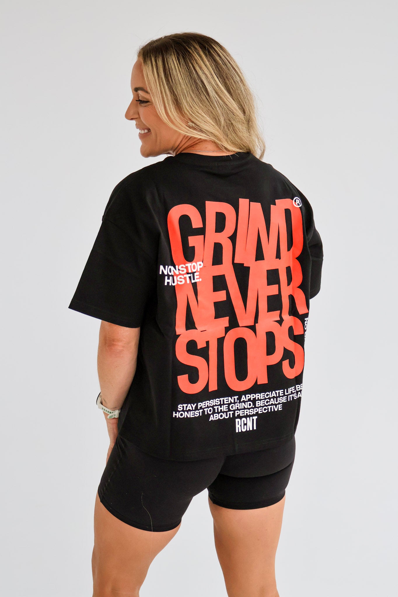 Woman wearing a black t-shirt with 'GRIND NEVER STOPS' text on the back, standing against a plain background. Woman wearing a black t-shirt with 'GRIND NEVER STOPS' text on the back, standing against a plain background.